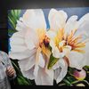 This is a creamy white paonia (peaony) flower in full bloom. These flowers are simply magnificent. They just seem to demand the attention of passersby. I could not resist the challenge of capturing on canvas this beauty from my garden. Though the paeonia is essentially a summer flower the warming of the spring sun is calling them out (and the ants on the buds are helping.) This is a bloom from the most historic summer, the summer of 2021.