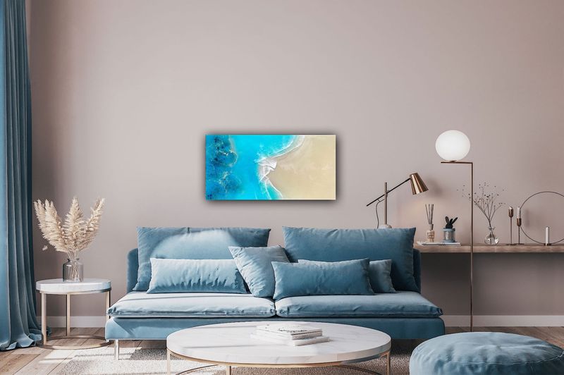 Original, one-of-a-kind, hand painted, inspired by the aerial view of The Bahamas and Turks And Caicos Islands from in my last vacation there Dealing with depression, PTSD and anxiety, painting is a form of therapy for me. In this painting I create a peaceful and safe space for the child and adult in me both, a place to freely express myself and where I can just be. As always this space is a beach, with healing vibes and powdery sand, where calm lucent ocean waters splash frothy waves on my feet, where I feel free and loved just the way I am. Due to the techniques used, this painting cannot be reproduced, repeated, recreated. Every painting obtained through my fluid painting techniques happens only once in an infinity of attempts. Due to its glossy finish its impossible to take perfect photos of the painting and be able to capture all the details emerged between layers in one same photo or to photograph it without having objects reflecting onto its surface. Different kinds of light & angles make looking at it a continuous process of discovery always looking slightly different and never boringly predictable This painting does not need to be framed, the painted image extends on the sides, it is wired, signed, ready to hang and comes with Certificate of Authenticity. The painting is painted in layers and that gives it a tridimensional aspect with intricate details that add richness and depth to the final image. My painting techniques make the paintings unique and impossible to recreate, reproduced, recreated thus ever more so special.