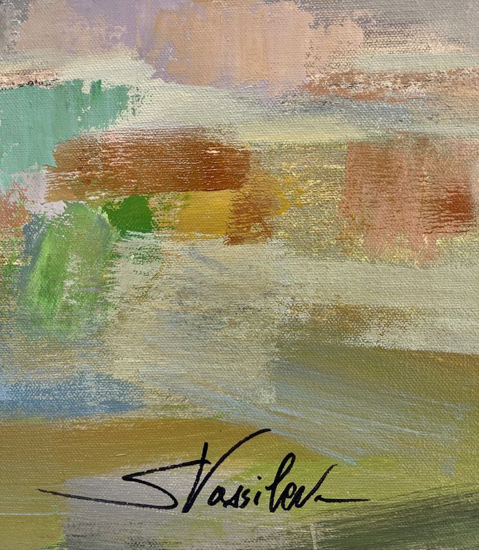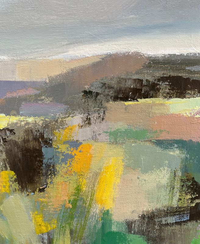 This abstracted landscape is inspired by spring meadows. Fresh green, yellow, chartreuse and teal are interacting with white and gray. Sharp contrast and bold brushstrokes create a dramatic effect. The painting is about youth and joy and it brings the nature indoors. Ships ready to hang within the US< rolled in a tube elsewhere.