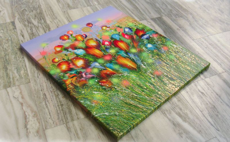 Welcome to my Gallery and thanks for your visit! If you are in need of some artwork that will be a conversation starter, look no further..This piece is not just an artwork; it's an exuberant experience, waiting to be shared and admired. **** In this vibrant artwork, I unleashed my passion for the natural world's fleeting beauty. Through abstract acrylic strokes and touches of gilding, I sought to capture the essence of blooming flowers bathed in the warm, glowing embrace of the setting sun. This painting is a celebration of life, inviting the viewer to revel in the joyful dance of color and light. It's meant to infuse any space with the energy of a serene, yet lively summer evening. **** *Size: 34.5" x 40" .... 87,5 x 101,5 cm *Canvas, acrylic paint, acrylic spray, gold leaf, varnish The artwork is signed, dated and titled on the reverse and ships in a tube. This method is particularly safe for oversized works and ensures lower transport costs. Rolled works may be easily stretched upon arrival (placed on wooden stretchers for canvases) and/or framed by a local framer. It's fast and inexpensive! * Certificate of Authenticity. **** SHIPPING: The painting will be wrapped carefully for shipment around the world to ensure safe arrival. * tracking number *