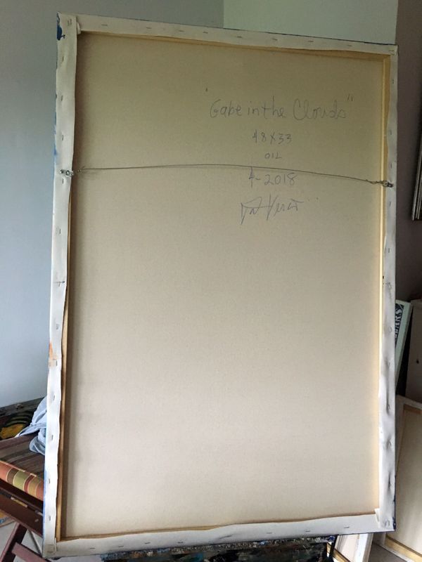 From my ongoing series of skies combined with my series of saints and angels. This is an outlined Archangel Gabriel, full of clouds and surrounded by them. Gabe playing his trumpet as he floats around the heavens. Oil on 48x33x.75 canvas, the edges are painted, signed front and back, wired to hang.